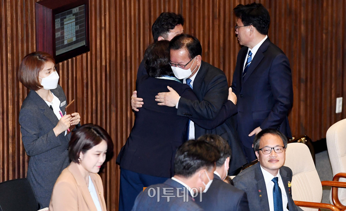 [포토] 동료 의원들과 인사하는 김부겸 의원