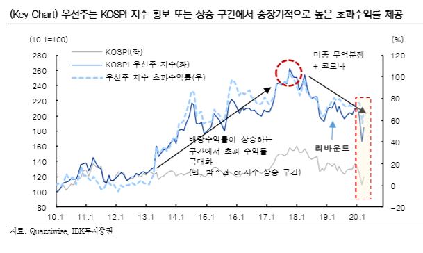 이정빈 IBK투자증권 연구원은 21일 “코스피 우선주 지수는 20개 우선주로 구성된 대표지수로 아웃퍼폼하는 구간은 △배당수익률이 증가하는 구간 △코스피 지수가 횡보 및 상승하는 구간 △코스피가 바닥에서 반등하는 구간으로 요약된다”고 설명했다.