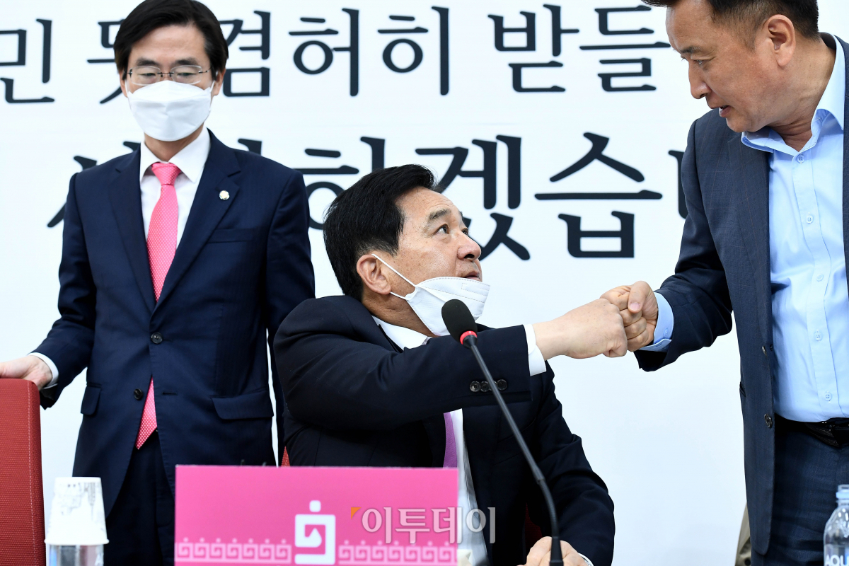 심재철(가운데) 미래통합당 대표 권한대행이 22일 서울 여의도 국회에서 최고위원회의 브리핑을 마친 뒤 김영환 최고위원과 인사하고 있다. 왼쪽은 조경태 최고위원. 통합당은 이날 회의에서 김종인 전 총괄선대위원장을 비상대책위원장으로 하는 비대위 체제로 전환하기로 결정했다.