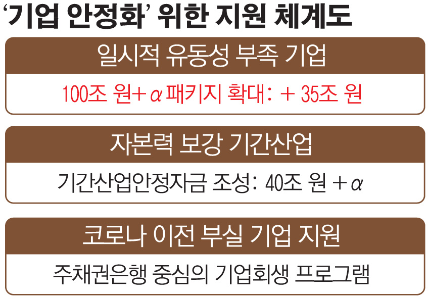 정부가 총 40조 원 규모로 기간산업안정기금을 조성한다. 기금의 지원대상은 고용과 국민경제 영향이 큰 항공, 해운, 조선, 자동차, 일반기계, 전력, 통신 등 7대 기간산업이다. 100조 원 규모로 운영되고 있던 민생·금융안정 패키지는 35조 원 늘리기로 했다.