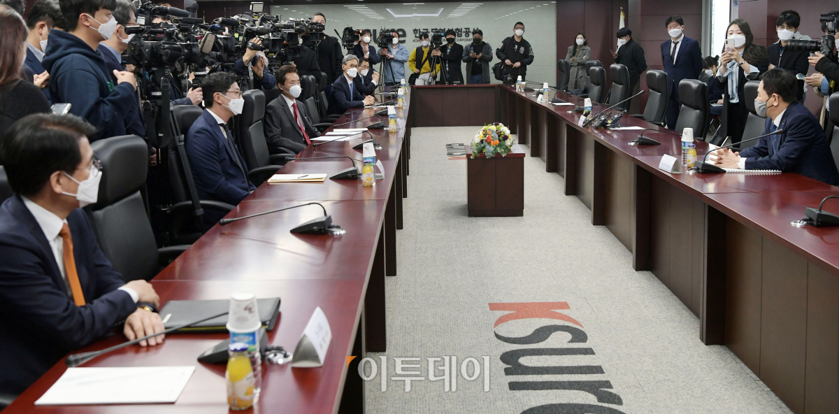22일 서울 종로구 한국무역보험공사에서 열린 정유업계 간담회에서 양수영 석유공사 사장(오른쪽)이 참석자들과 대화하고 있다.