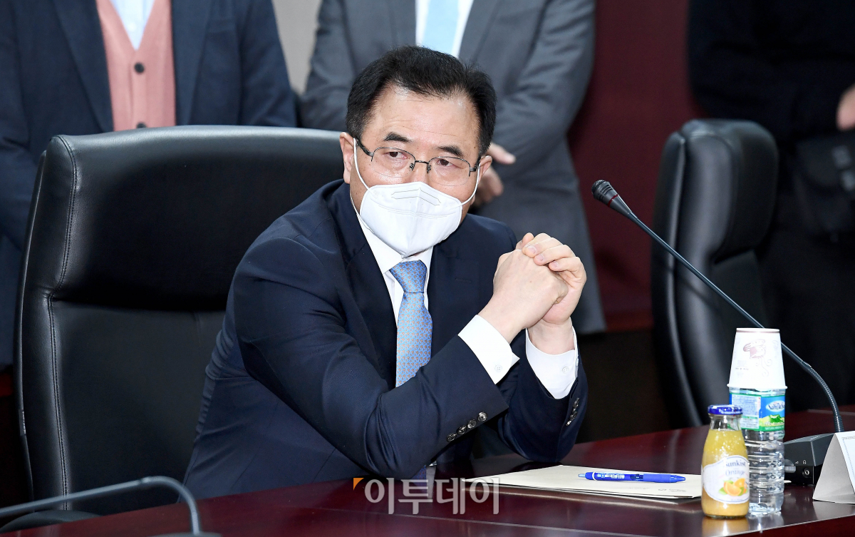 강달호 현대오일뱅크 대표가 22일 서울 종로구 한국무역보험공사에서 열린 산업부-정유업계 CEO 간담회에서 성윤모 산업통상자원부 장관의 모두발언을 듣고 있다.