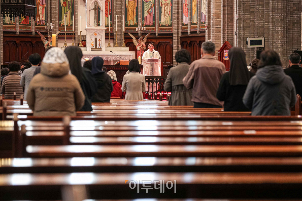 신종 코로나 바이러스 감염증(코로나19) 확산으로 중단된 천주교 미사가 두 달 만에 재개된 23일 서울 명동성당에서 신자들이 미사에 참여하고 있다. 이번 미사 재개 결정은 정부가 지난 19일 종교시설 등에 대해 현재의 방역지침 준수 명령을 유지하되, 운영중단 강력권고는 해제한다고 발표하면서 이뤄졌다. 서울대교구는 교구 내 232개 성당의 모든 신자에게 발열 체크 및 명단 기록 등을 지시했으며, 신자들이 대거 몰릴 것에 대비해 당분간 번호표를 받고 선착순으로 입장이 가능하다.