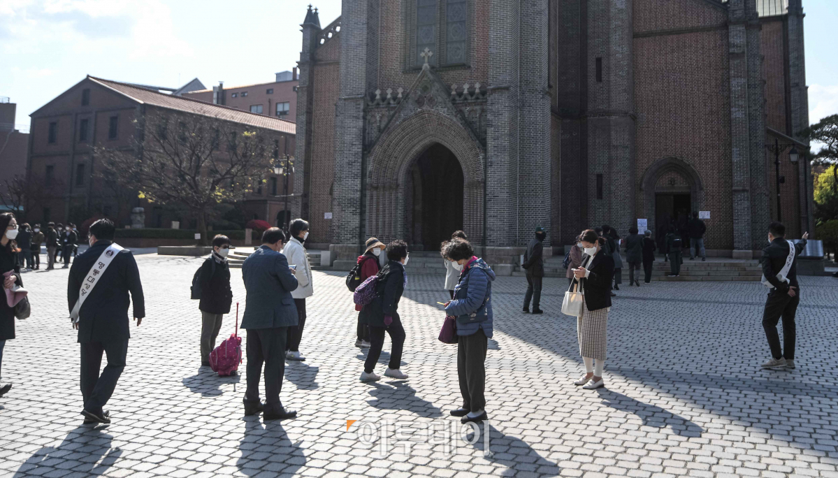 신종 코로나 바이러스 감염증(코로나19) 확산으로 중단된 천주교 미사가 두 달 만에 재개된 23일 서울 명동성당에서 신자들이 미사에 참여하기 위해 줄지어 서있다. 이번 미사 재개 결정은 정부가 지난 19일 종교시설 등에 대해 현재의 방역지침 준수 명령을 유지하되, 운영중단 강력권고는 해제한다고 발표하면서 이뤄졌다. 서울대교구는 교구 내 232개 성당의 모든 신자에게 발열 체크 및 명단 기록 등을 지시했으며, 신자들이 대거 몰릴 것에 대비해 당분간 번호표를 받고 선착순으로 입장이 가능하다.