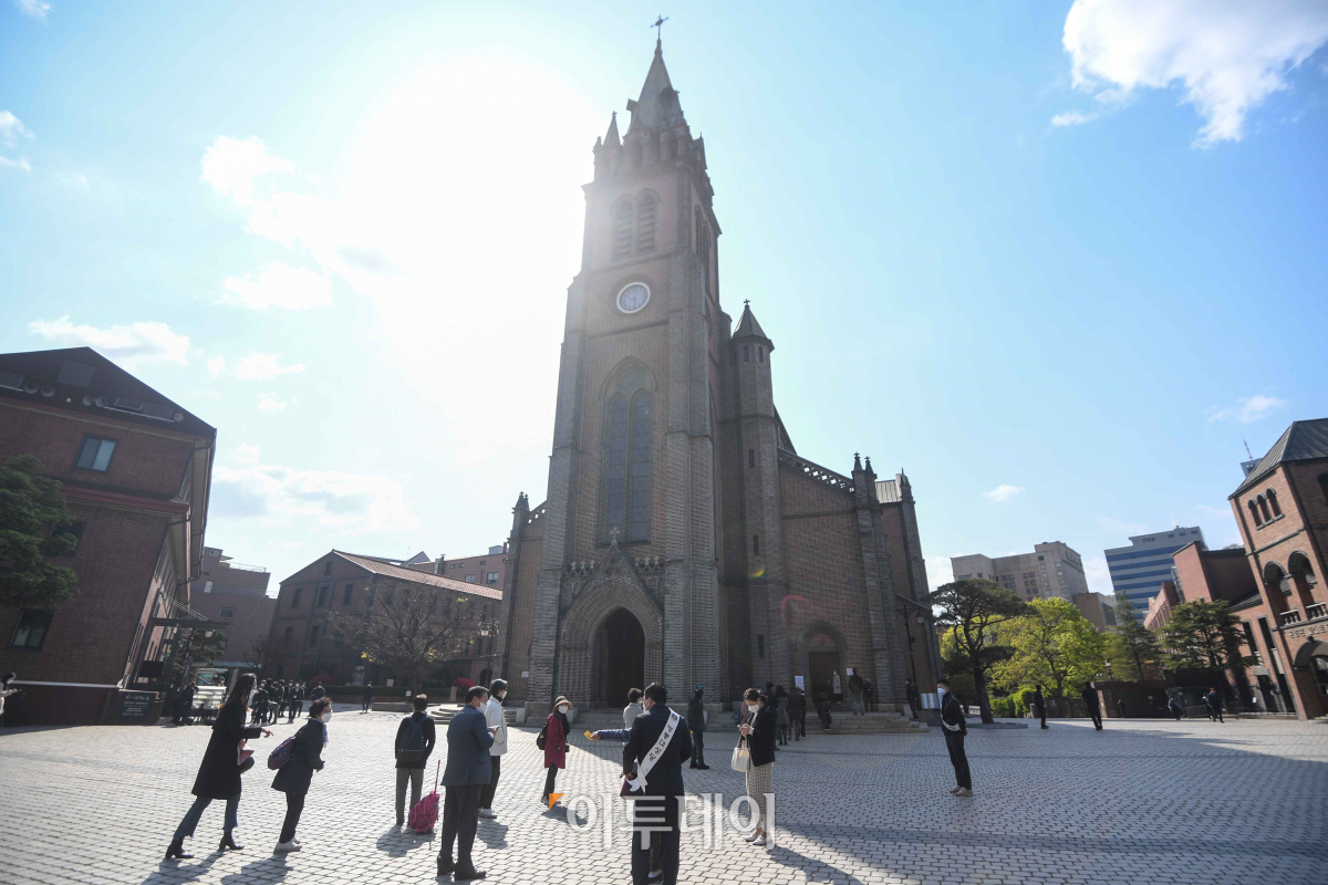 신종 코로나 바이러스 감염증(코로나19) 확산으로 중단된 천주교 미사가 두 달 만에 재개된 23일 서울 명동성당에서 신자들이 미사에 참여하기 위해 줄지어 서있다. 이번 미사 재개 결정은 정부가 지난 19일 종교시설 등에 대해 현재의 방역지침 준수 명령을 유지하되, 운영중단 강력권고는 해제한다고 발표하면서 이뤄졌다. 서울대교구는 교구 내 232개 성당의 모든 신자에게 발열 체크 및 명단 기록 등을 지시했으며, 신자들이 대거 몰릴 것에 대비해 당분간 번호표를 받고 선착순으로 입장이 가능하다.
