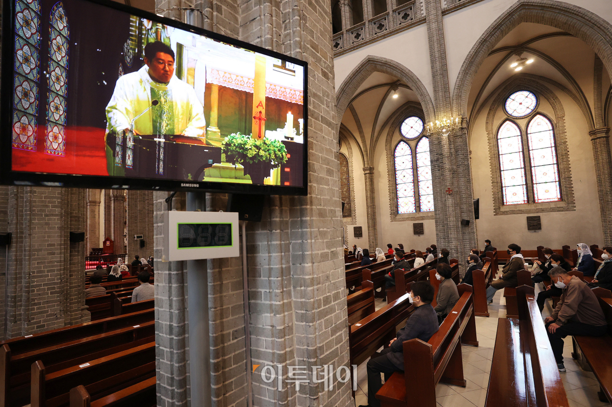신종 코로나 바이러스 감염증(코로나19) 확산으로 중단된 천주교 미사가 두 달 만에 재개된 23일 서울 명동성당에서 신자들이 미사에 참여하고 있다. 이번 미사 재개 결정은 정부가 지난 19일 종교시설 등에 대해 현재의 방역지침 준수 명령을 유지하되, 운영중단 강력권고는 해제한다고 발표하면서 이뤄졌다. 서울대교구는 교구 내 232개 성당의 모든 신자에게 발열 체크 및 명단 기록 등을 지시했으며, 신자들이 대거 몰릴 것에 대비해 당분간 번호표를 받고 선착순으로 입장이 가능하다.