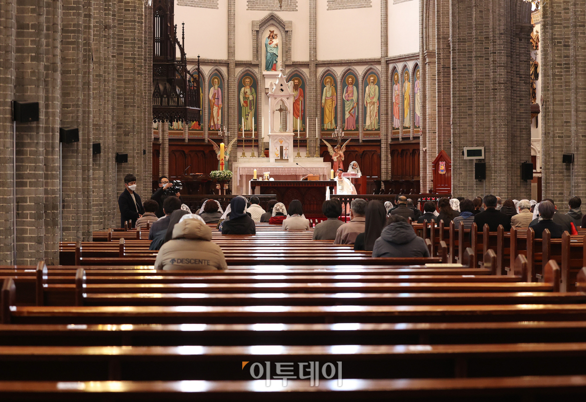 신종 코로나 바이러스 감염증(코로나19) 확산으로 중단된 천주교 미사가 두 달 만에 재개된 23일 서울 명동성당에서 신자들이 미사에 참여하고 있다. 이번 미사 재개 결정은 정부가 지난 19일 종교시설 등에 대해 현재의 방역지침 준수 명령을 유지하되, 운영중단 강력권고는 해제한다고 발표하면서 이뤄졌다. 서울대교구는 교구 내 232개 성당의 모든 신자에게 발열 체크 및 명단 기록 등을 지시했으며, 신자들이 대거 몰릴 것에 대비해 당분간 번호표를 받고 선착순으로 입장이 가능하다.