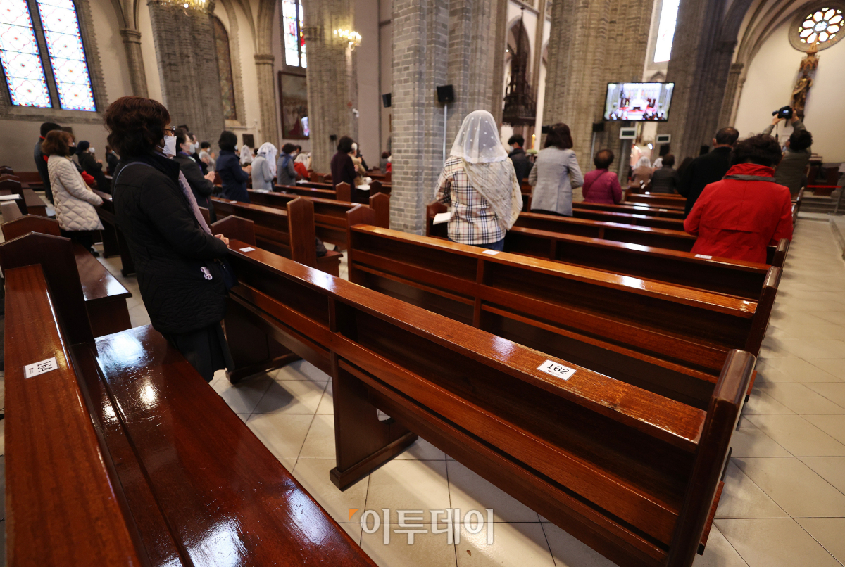 신종 코로나 바이러스 감염증(코로나19) 확산으로 중단된 천주교 미사가 두 달 만에 재개된 23일 서울 명동성당에서 신자들이 미사에 참여하고 있다. 이번 미사 재개 결정은 정부가 지난 19일 종교시설 등에 대해 현재의 방역지침 준수 명령을 유지하되, 운영중단 강력권고는 해제한다고 발표하면서 이뤄졌다. 서울대교구는 교구 내 232개 성당의 모든 신자에게 발열 체크 및 명단 기록 등을 지시했으며, 신자들이 대거 몰릴 것에 대비해 당분간 번호표를 받고 선착순으로 입장이 가능하다.