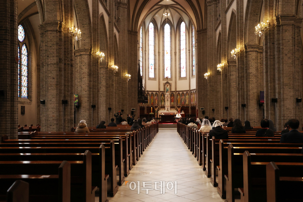 신종 코로나 바이러스 감염증(코로나19) 확산으로 중단된 천주교 미사가 두 달 만에 재개된 23일 서울 명동성당에서 신자들이 미사에 참여하고 있다. 이번 미사 재개 결정은 정부가 지난 19일 종교시설 등에 대해 현재의 방역지침 준수 명령을 유지하되, 운영중단 강력권고는 해제한다고 발표하면서 이뤄졌다. 서울대교구는 교구 내 232개 성당의 모든 신자에게 발열 체크 및 명단 기록 등을 지시했으며, 신자들이 대거 몰릴 것에 대비해 당분간 번호표를 받고 선착순으로 입장이 가능하다.