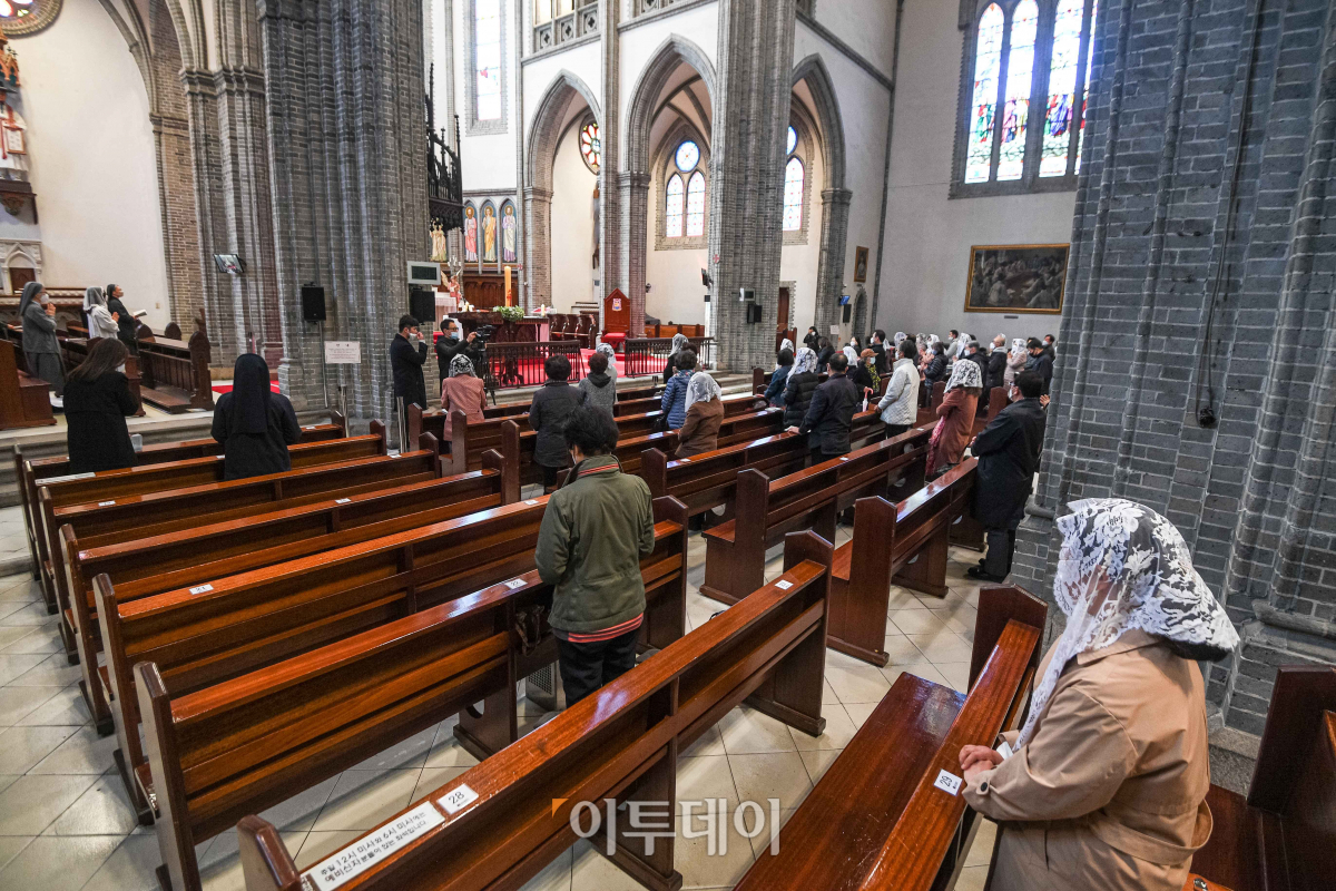 신종 코로나 바이러스 감염증(코로나19) 확산으로 중단된 천주교 미사가 두 달 만에 재개된 23일 서울 명동성당에서 신자들이 미사에 참여하고 있다. 이번 미사 재개 결정은 정부가 지난 19일 종교시설 등에 대해 현재의 방역지침 준수 명령을 유지하되, 운영중단 강력권고는 해제한다고 발표하면서 이뤄졌다. 서울대교구는 교구 내 232개 성당의 모든 신자에게 발열 체크 및 명단 기록 등을 지시했으며, 신자들이 대거 몰릴 것에 대비해 당분간 번호표를 받고 선착순으로 입장이 가능하다.