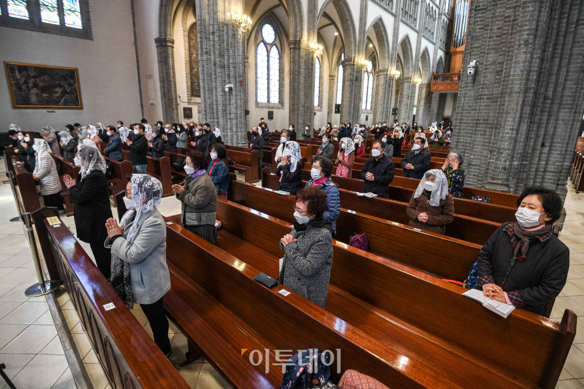 신종 코로나 바이러스 감염증(코로나19) 확산으로 중단된 천주교 미사가 두 달 만에 재개된 23일 서울 명동성당에서 신자들이 미사에 참여하고 있다. 이번 미사 재개 결정은 정부가 지난 19일 종교시설 등에 대해 현재의 방역지침 준수 명령을 유지하되, 운영중단 강력권고는 해제한다고 발표하면서 이뤄졌다. 서울대교구는 교구 내 232개 성당의 모든 신자에게 발열 체크 및 명단 기록 등을 지시했으며, 신자들이 대거 몰릴 것에 대비해 당분간 번호표를 받고 선착순으로 입장이 가능하다.