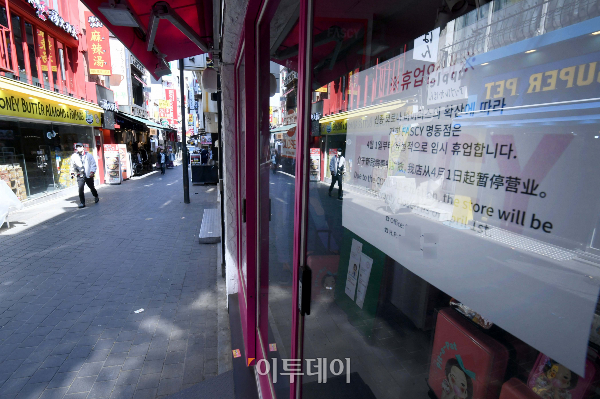 신종 코로나바이러스 감염증(코로나19)에 따른 경제 충격으로 올해 1분기 한국경제 성장률이 –1.4%로 떨어졌다. 23일 한국은행은 지난 1분기 실질 국내총생산(GDP)이 460조9703억원으로 전 분기보다 1.4%(6조5246억원) 감소했다고 발표했다. 2008년 4분기(-3.3%) 이후 11년 3개월 만의 최저 성장률이다. 민간소비는 재화 소비와 서비스 항목 등이 모두 줄어들어 1분기에 6.4% 감소, 1998년 1분기 외환위기(-13.8%) 이후 22년 만의 최저치를 기록했다. 이날 서울 중구 명동의 상점에 임시휴업 안내문이 붙어있는 등 거리가 썰렁하다.