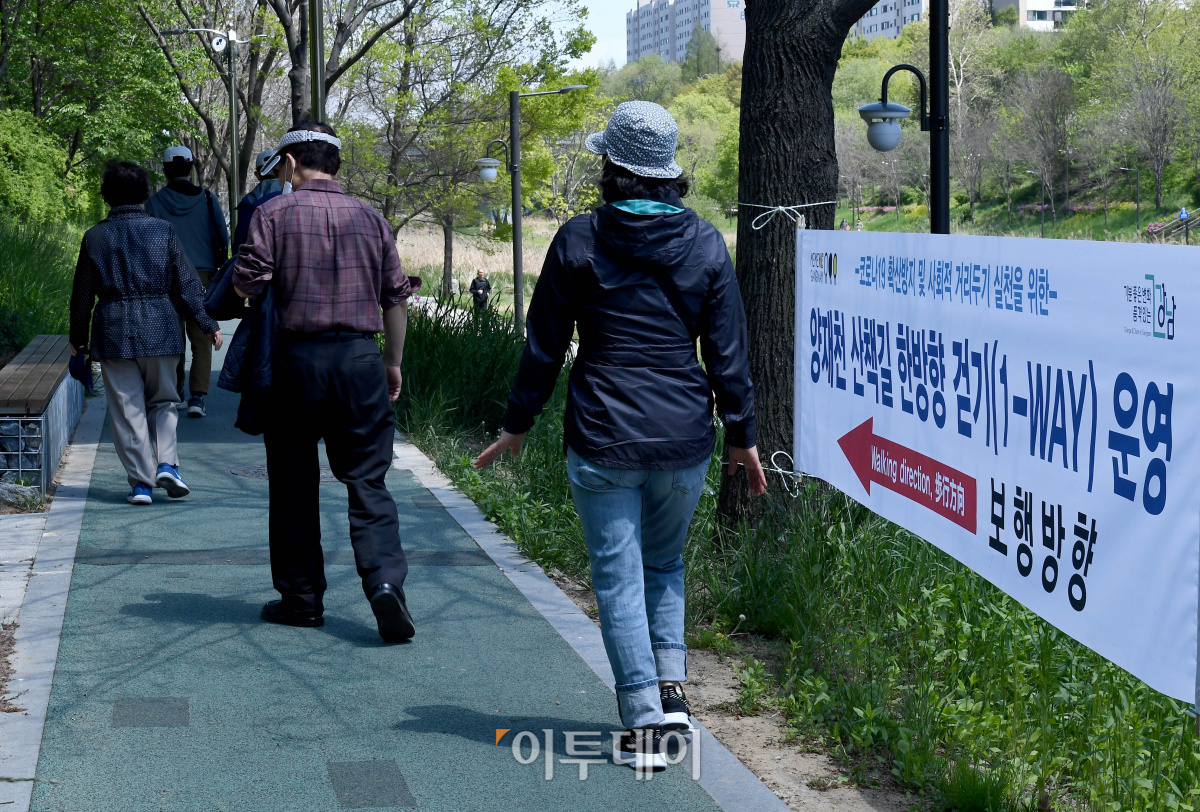 사회적 거리두기 완화로 양재천 산책로가 개방된 26일 서울 양재천에서 시민들이 산책을 즐기고 있다. 강남구와 서초구는 신종 코로나바이러스 감염증(코로나19) 확산 방지를 위해 지난 4일부터 주말마다 양재천을 통제했다.