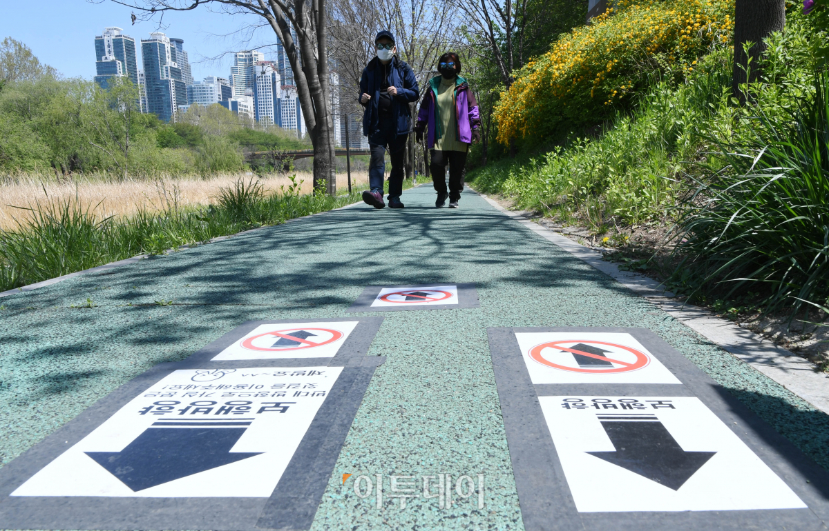 사회적 거리두기 완화로 양재천 산책로가 개방된 26일 서울 양재천에서 시민들이 산책을 즐기고 있다. 강남구와 서초구는 신종 코로나바이러스 감염증(코로나19) 확산 방지를 위해 지난 4일부터 주말마다 양재천을 통제했다.