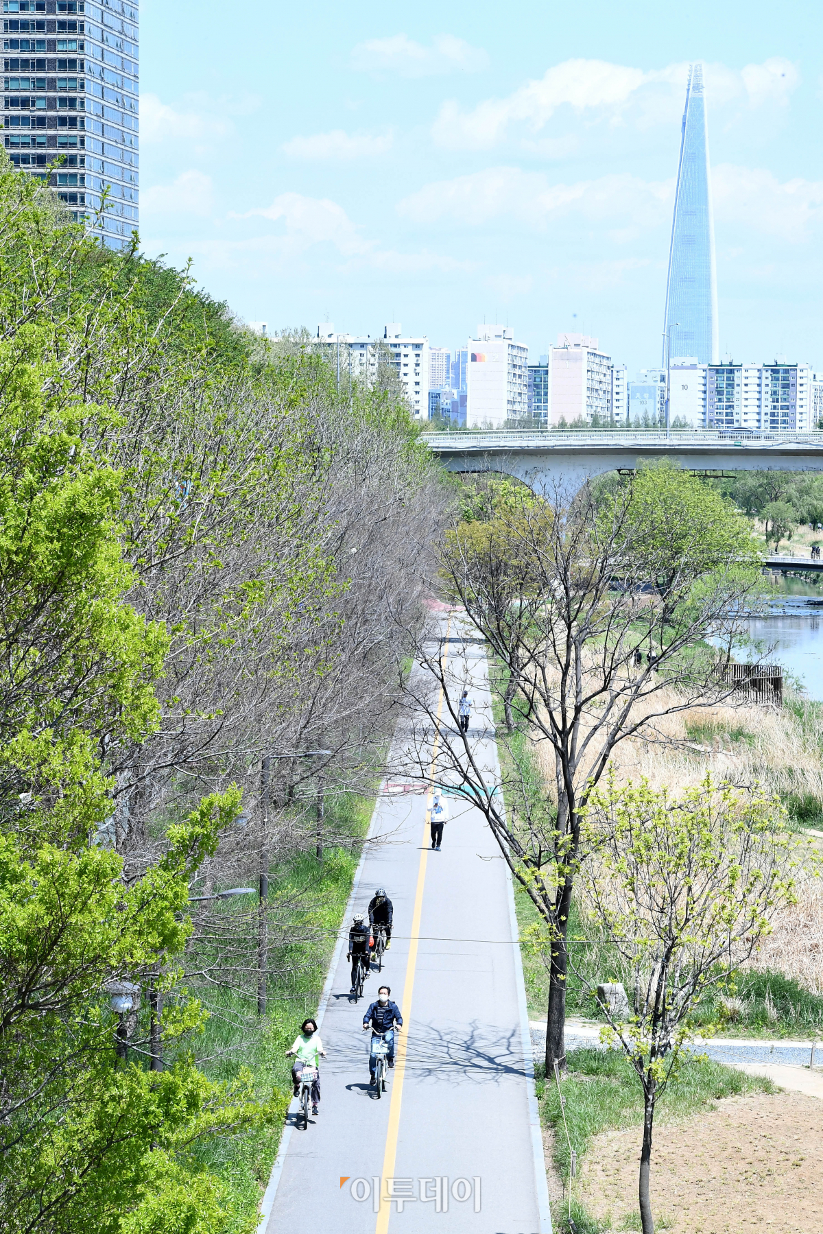 사회적 거리두기 완화로 양재천 산책로가 개방된 26일 서울 양재천에서 시민들이 산책을 즐기고 있다. 강남구와 서초구는 신종 코로나바이러스 감염증(코로나19) 확산 방지를 위해 지난 4일부터 주말마다 양재천을 통제했다.