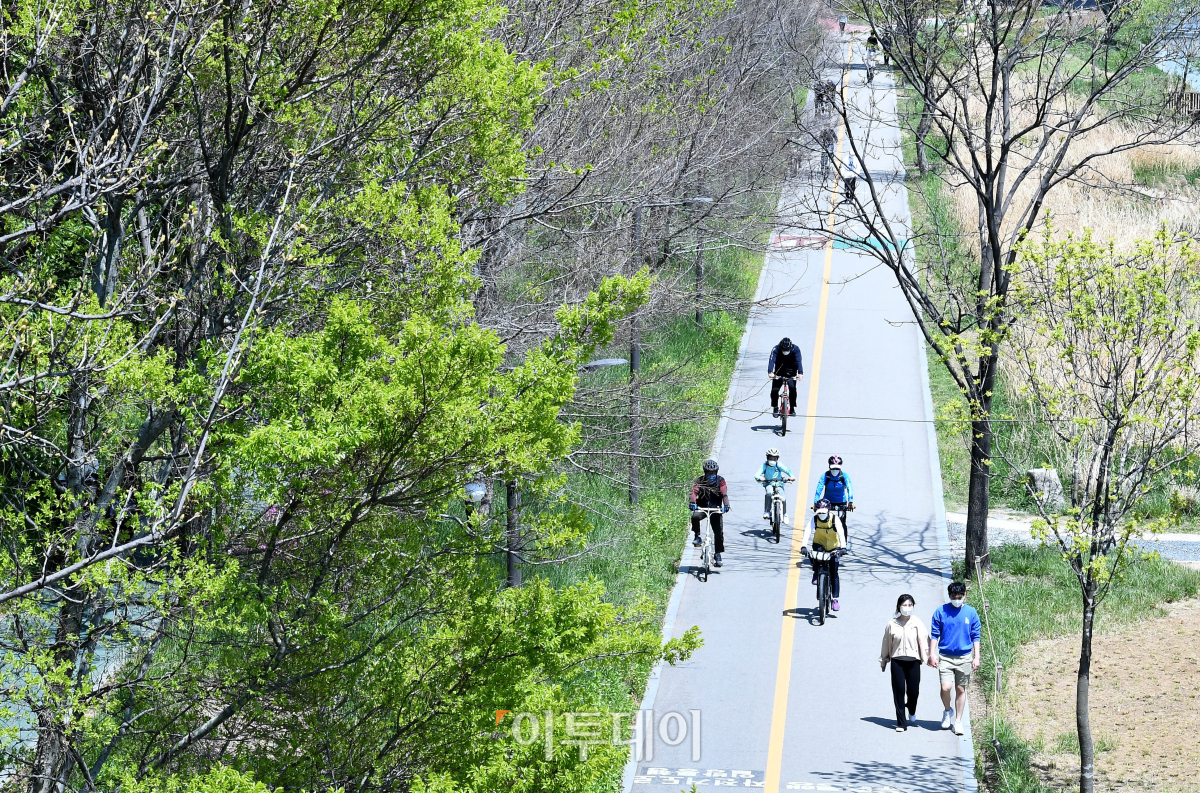 사회적 거리두기 완화로 양재천 산책로가 개방된 26일 서울 양재천에서 시민들이 산책을 즐기고 있다. 강남구와 서초구는 신종 코로나바이러스 감염증(코로나19) 확산 방지를 위해 지난 4일부터 주말마다 양재천을 통제했다.