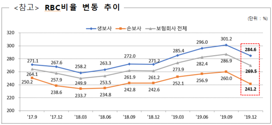 27일 금융감독원에 따르면 지난해 12월말 보험회사의 RBC비율(가용자본/요구자본)은 269.5%로 9월말(286.9%) 대비 17.4%p 하락했다.