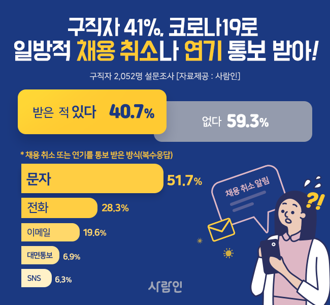 27일 사람인이 구직지 2052명을 대상으로 ‘코로나19로 채용 취소 또는 연기를 통보 받은 경험’에 대해 조사한 결과에 따르면 40.7%가 ‘있다’고 답변했다.
