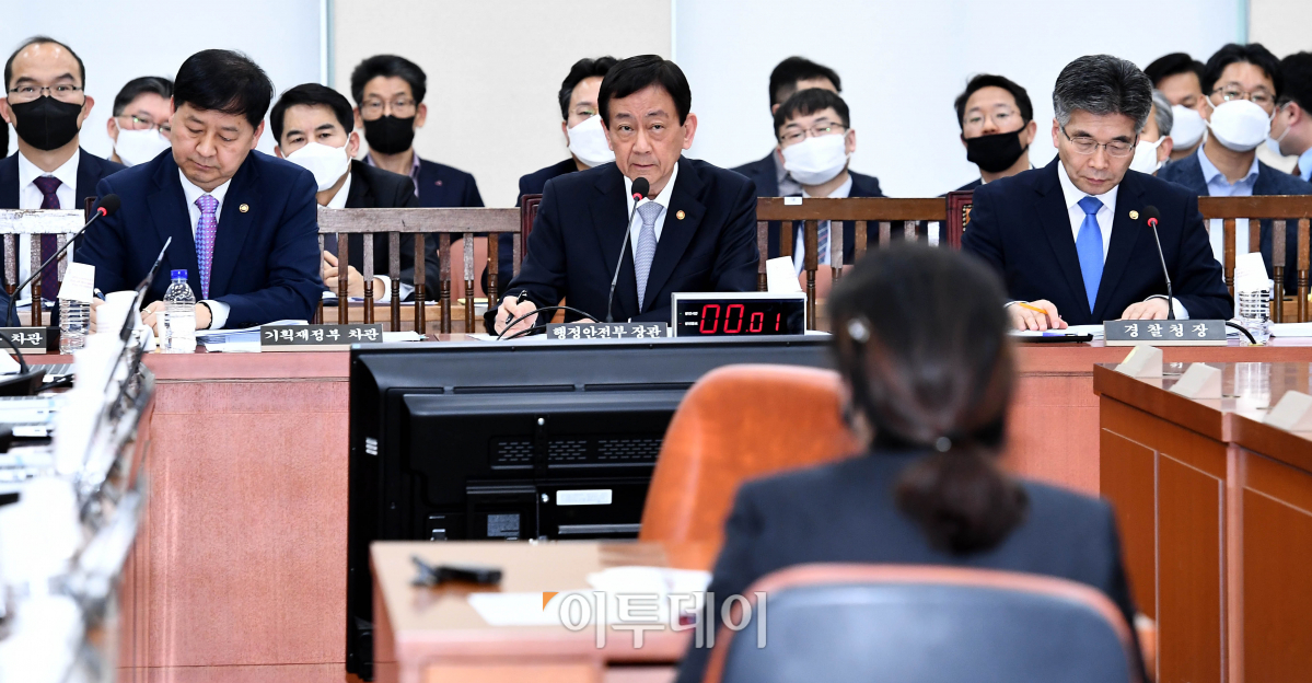 진영 행정안전부 장관이 27일 서울 여의도 국회에서 열린 행정안전위원회 전체회의에서 의원의 질의에 답하고 있다.