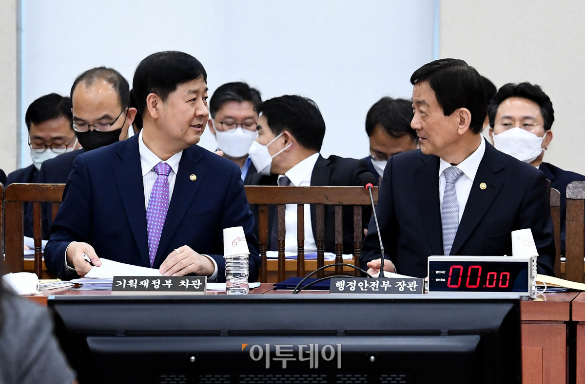 진영(오른쪽) 행정안전부 장관과 구윤철 기획재정부 2차관이 27일 서울 여의도 국회에서 열린 행정안전위원회 전체회의에 앞서 대화하고 있다.