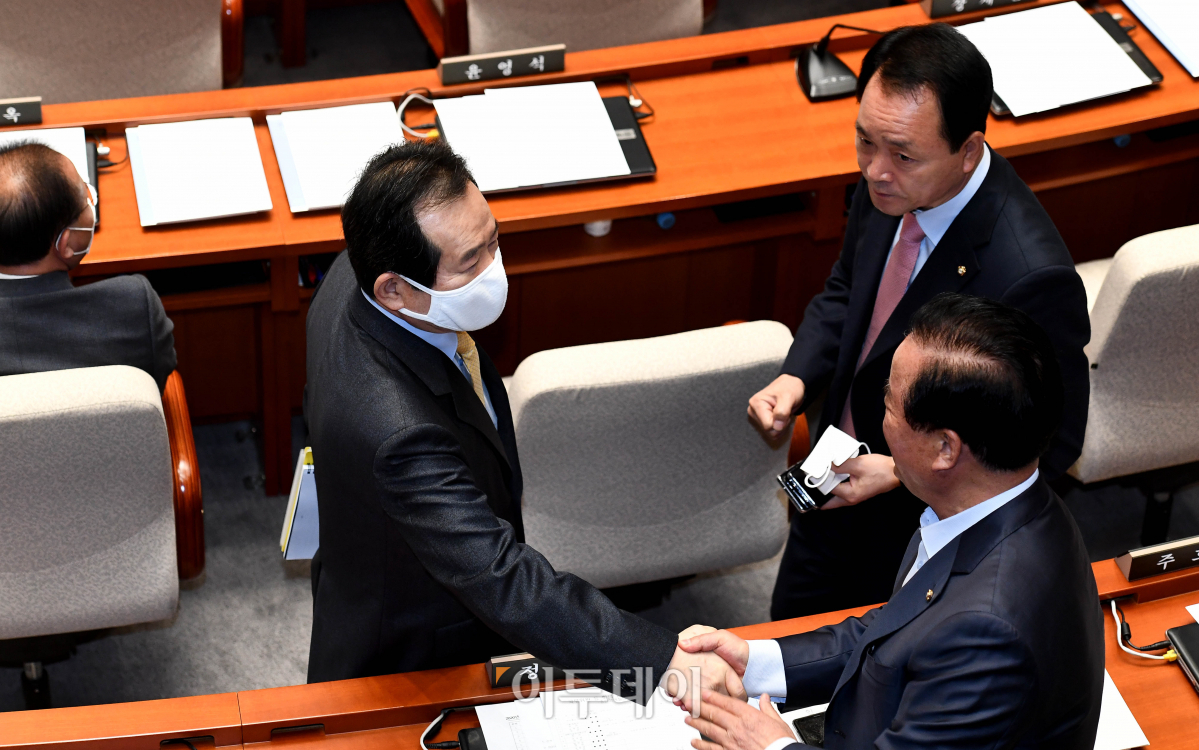정세균 국무총리가 28일 서울 여의도 국회에서 긴급재난지원금 지급 추가경정예산안 심사를 위해 열린 예산결산특별위원회 전체회의에 앞서 의원들과 인사하고 있다.