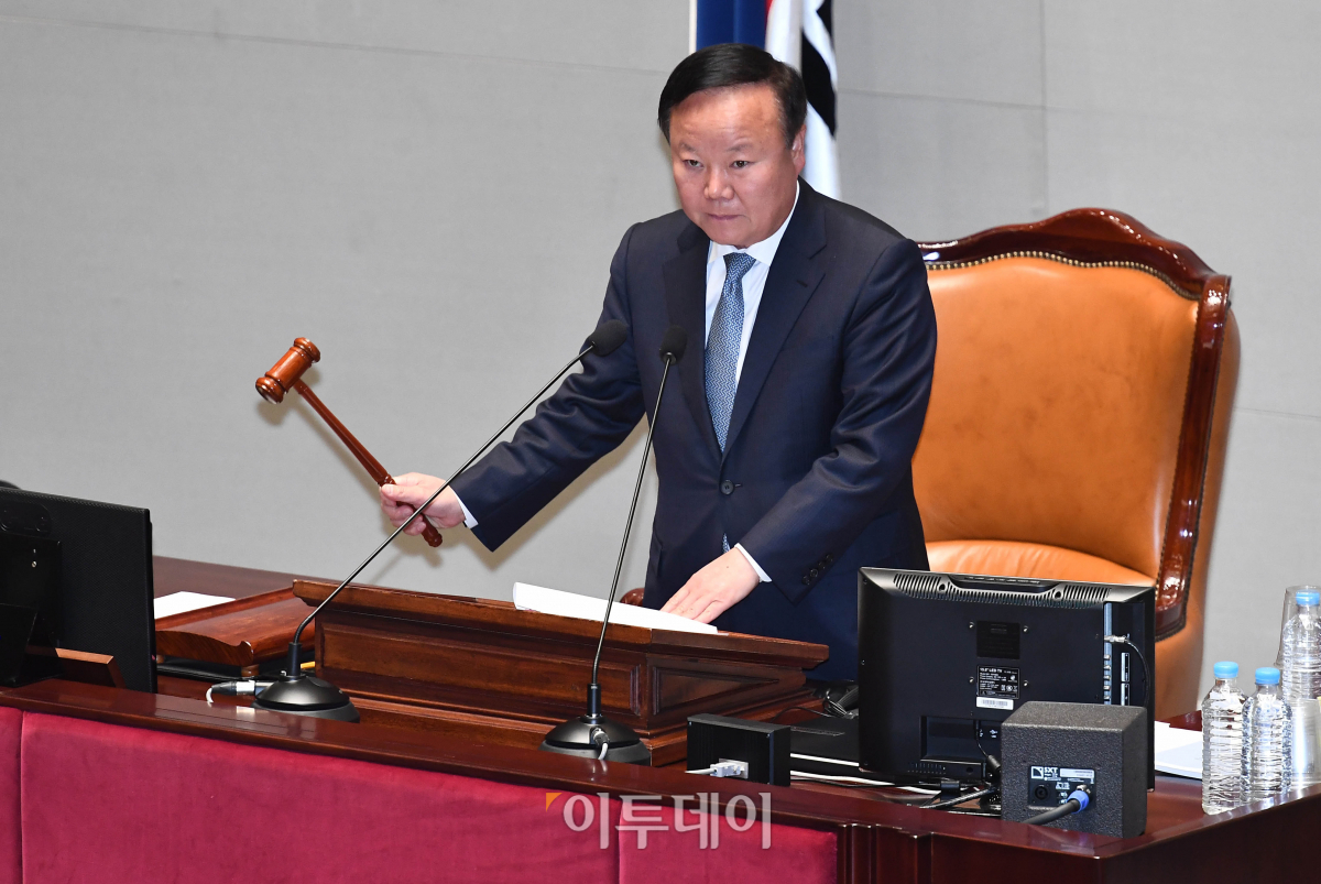 28일 서울 여의도 국회에서 긴급재난지원금 지급 추가경정예산안 심사를 위해 열린 예산결산특별위원회 전체회의에서 김재원 위원장이 의사봉을 두드리고 있다.
