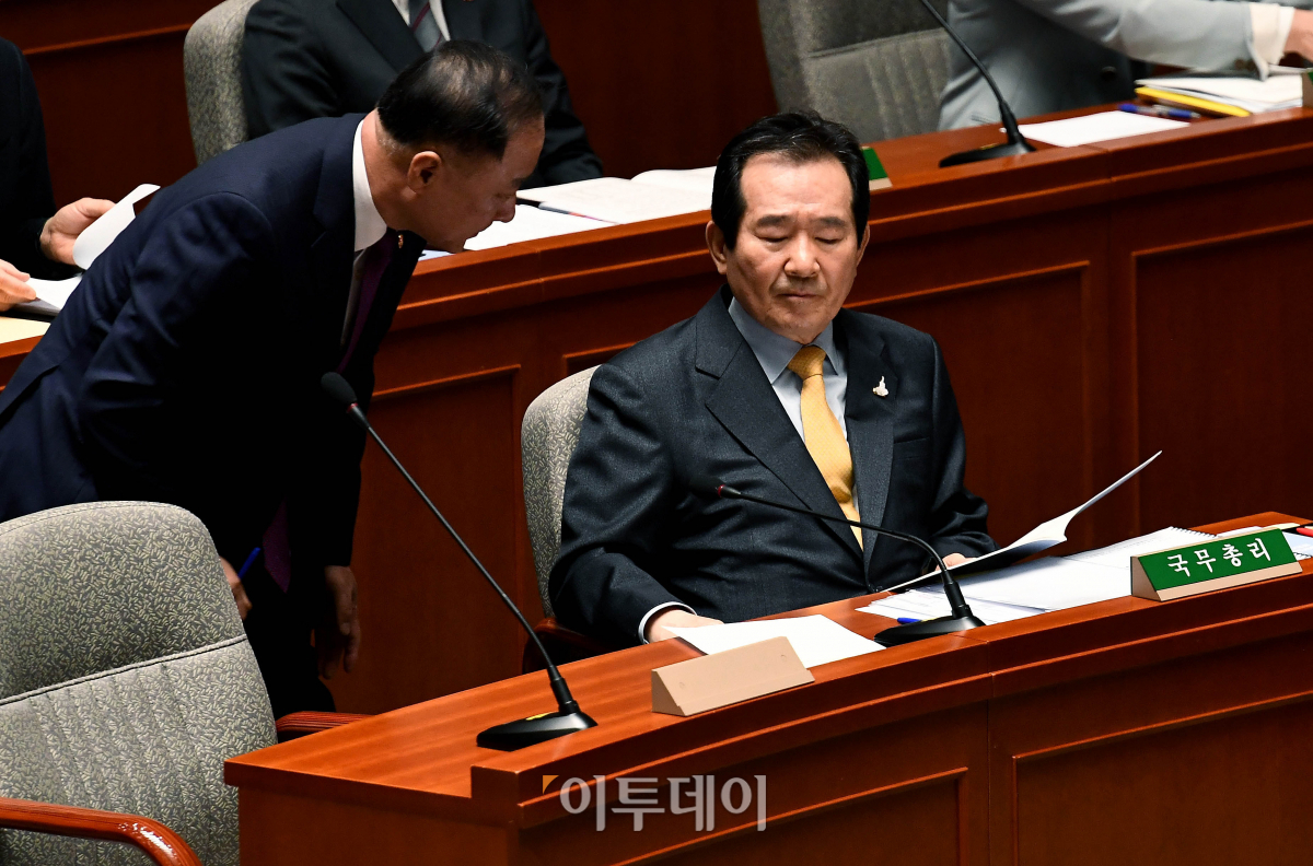 정세균(오른쪽) 국무총리와 홍남기 부총리 겸 기획재정부 장관이 28일 서울 여의도 국회에서 긴급재난지원금 지급 추가경정예산안 심사를 위해 열린 예산결산특별위원회 전체회의에서 대화하고 있다.