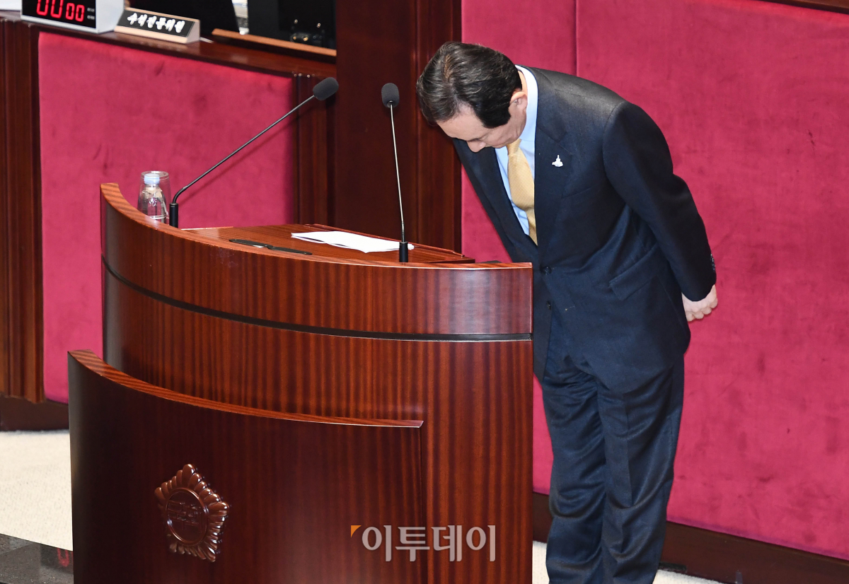 정세균 국무총리가 28일 서울 여의도 국회에서 긴급재난지원금 지급 추가경정예산안 심사를 위해 열린 예산결산특별위원회 전체회의에서 제안설명에 앞서 인사하고 있다.