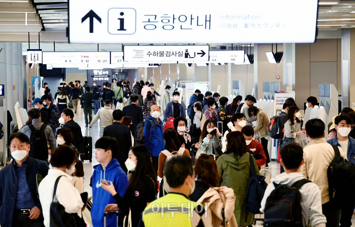 신종 코로나바이러스 감염증(코로나19) 대응 사회적 거리두기가 완화된 가운데 황금연휴를 앞둔 28일 서울 강서구 김포공항 국내선 청사가 승객들로 붐비고 있다. 제주도는 연휴기간인 29일부터 내달 5일까지 제주 방문 관광객을 17만9000여 명으로 예상하고 있다.