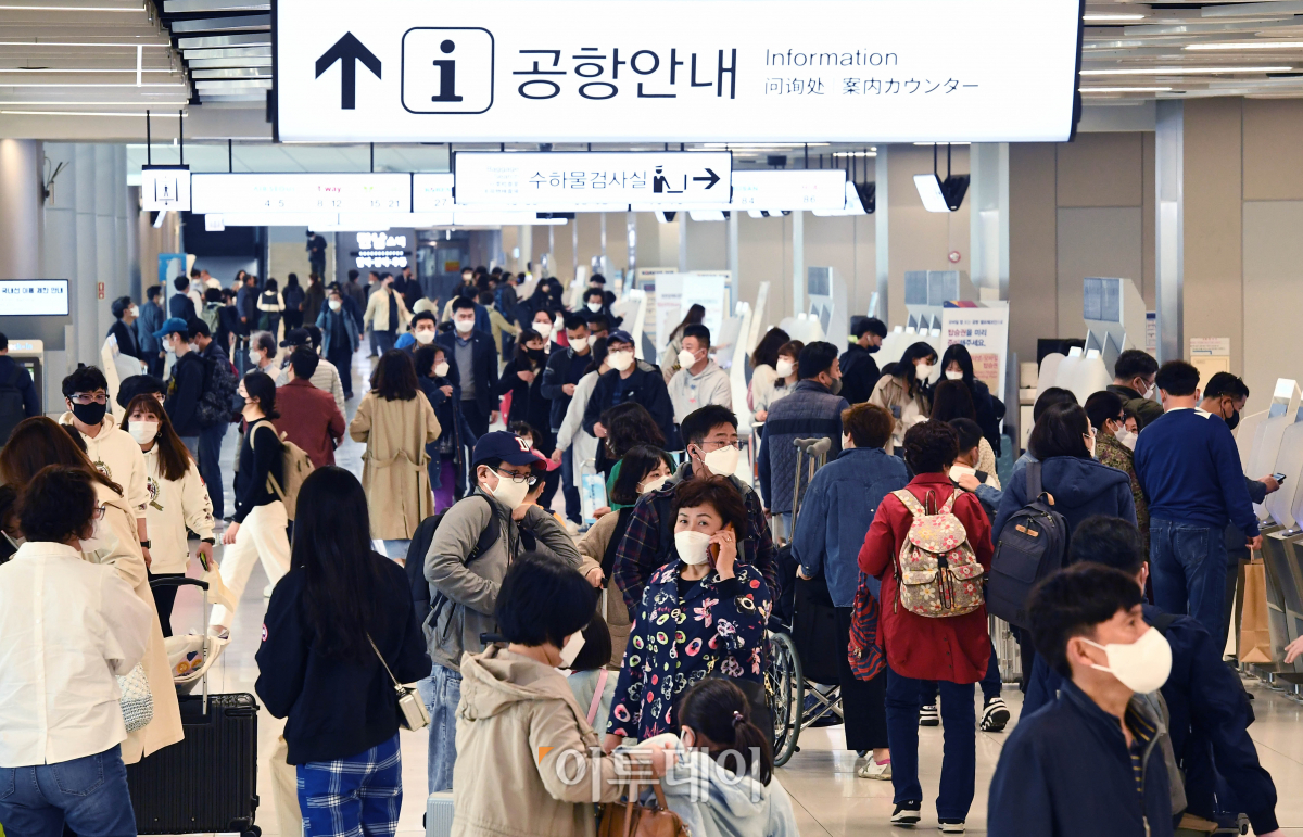 신종 코로나바이러스 감염증(코로나19) 대응 사회적 거리두기가 완화된 가운데 황금연휴를 앞둔 28일 서울 강서구 김포공항 국내선 청사가 승객들로 붐비고 있다. 제주도는 연휴기간인 29일부터 내달 5일까지 제주 방문 관광객을 17만9000여 명으로 예상하고 있다.