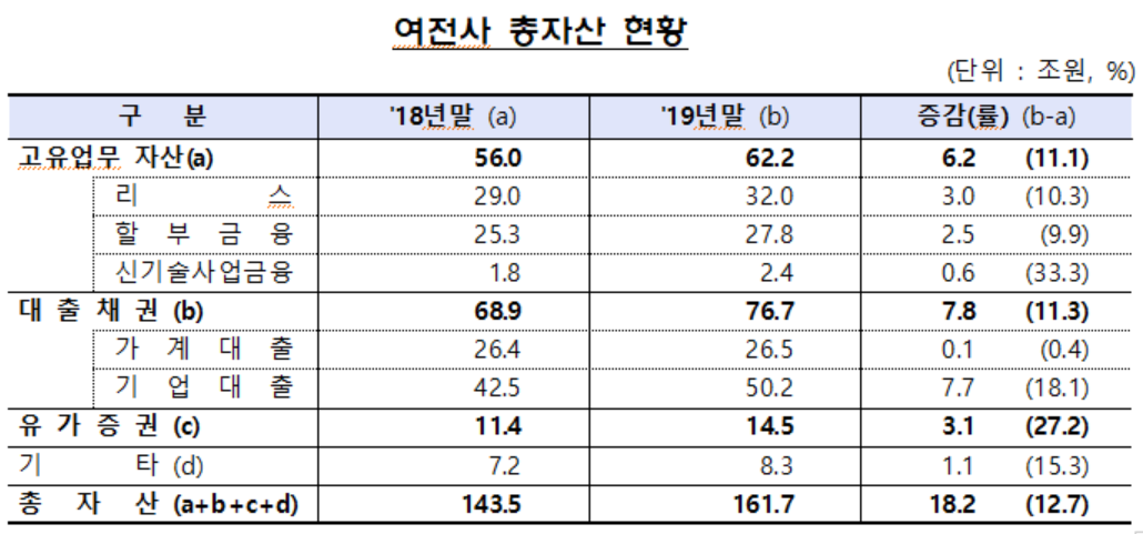 고유업무 자산은 62조2000억 원으로 리스ㆍ할부자산 등 증가 영향으로 전년말(56조 원) 대비 11.1%(6조2000억 원) 증가했다.
