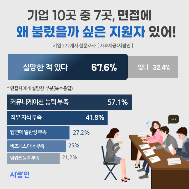 29일 사람인이 기업 272개사를 대상으로 '면접에서 지원자에게 실망해 면접 제시한 것을 후회한 경험'에 대해 조사한 결과, 67.6%가 '후회한 경험이 있다'고 답했다.