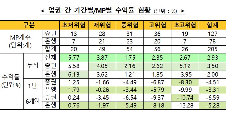 회사별 평균 누적수익률은 DB금융투자가 9.53%로 1위로 집계되었으며, 각 MP중에서는 키움증권 기본투자형(초고위험)이 누적수익률 29.4%로 전체 수익률 1위에 올랐다.