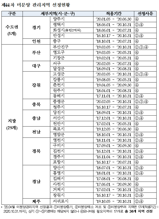 경기 양주시 등 나머지 지역은 그대로 미분양 관리지역으로 남았다. 현재 미분양 관리지역 내 미분양 주택은 2만5220가구다. 전국 미분양 주택(3만8304가구) 셋 중 둘이 미분양 관리지역에 몰려 있다.