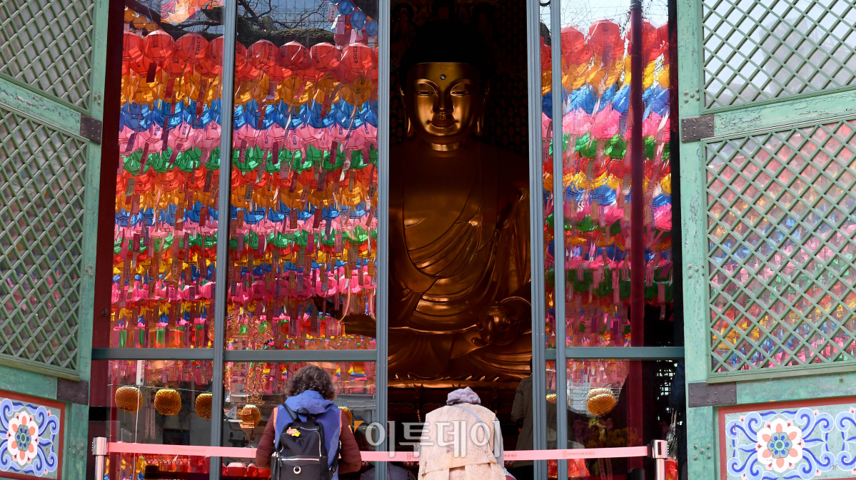 부처님오신날을 하루 앞둔 29일 서울 종로구 조계사에서 불자들이 예불을 드리고 있다.