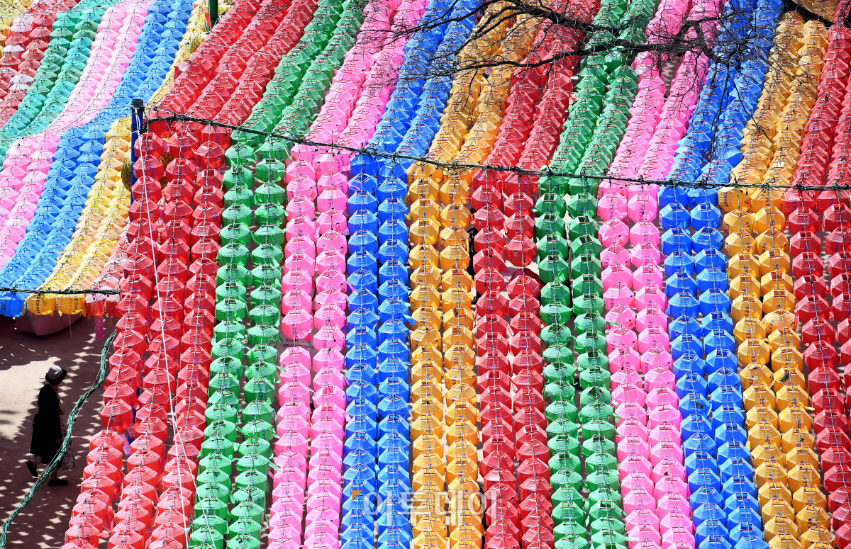 부처님오신날을 하루 앞둔 29일 서울 종로구 조계사에 형형색색 연등이 설치돼 있다.
