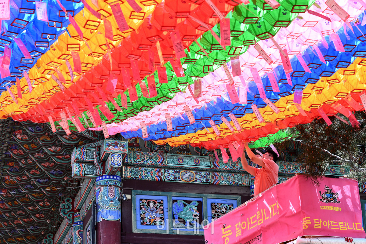 부처님오신날을 하루 앞둔 29일 서울 종로구 조계사에서 관계자가 형형색색 연등에 등표를 달고 있다.
