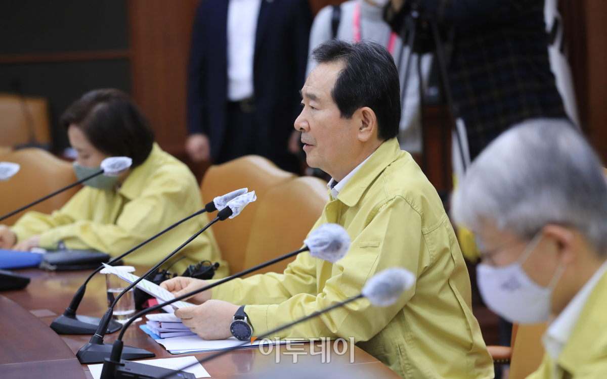 정세균 국무총리가 3일 서울 종로구 정부서울청사에서 열린 신종 코로나바이러스 감염증(코로나19) 대응 중앙재난안전대책본부(중대본) 회의에서 모두발언을 하고 있다.