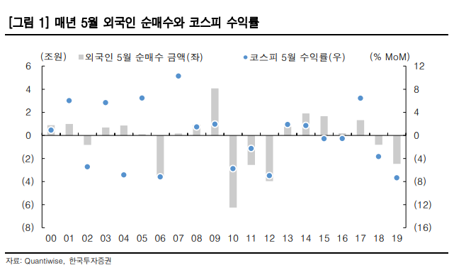 다만 김 연구원은 한국의 수출 부진 등이 부담으로 작용, 올해 5월엔 외국인이 주식을 팔 확률이 높다고 분석했다.