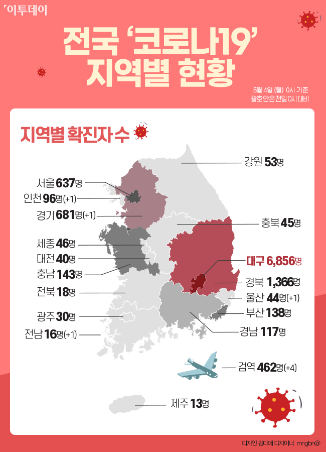 이로써 전국 시·도별 '코로나19' 확진자 수는 △대구 6856명 △경북 1366명으로 가장 많은 비중을 차지했다. 이어 △경기 681명 △서울 637명 △검역소 462명 △충남 143명 △부산 138명 △경남 117명 △인천 96명 △강원 53명 △세종 46명 △충북 45명 △울산 44명 △대전 40명 △광주 30명 △전북 18명 △전남 16명 △제주 13명 순으로 나타났다.