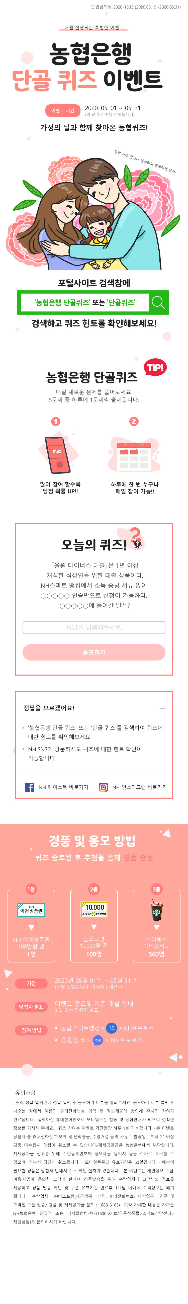 NH농협은행은 농협은행의 모바일 플랫폼인 NH스마트뱅킹과 올원뱅크에서 5월 1일부터 31일까지 한 달간 '5월 농협은행 단골퀴즈 이벤트'를 실시한다고 4일 밝혔다.