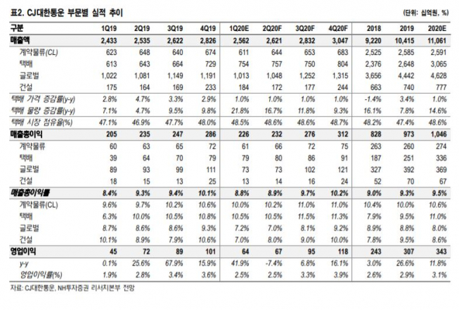 아울러 "동남아 일부 국가 및 미국의 물동량 둔화로 매출 감소가 예상되며 상반기까지는 택배 부문 실적 개선이 글로벌 부문 실적 부진으로 상쇄될 전망"이라고 덧붙였다.