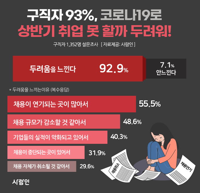 6일 사람인이 구직자 1352명을 대상으로 '코로나19로 상반기 취업에 대한 두려움을 느끼는지 여부'를 조사한 결과, 92.9%가 '두려움을 느낀다'고 답했다.