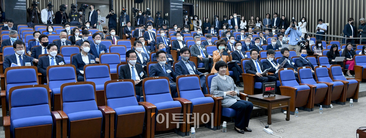 6일 서울 여의도 국회에서 열린 더불어민주당 원내대표 후보자 합동토론회에서 김영주 선관위원장과 초선의원 등이 김태년(기호순), 전해철, 정성호 후보자의 토론을 듣고 있다.