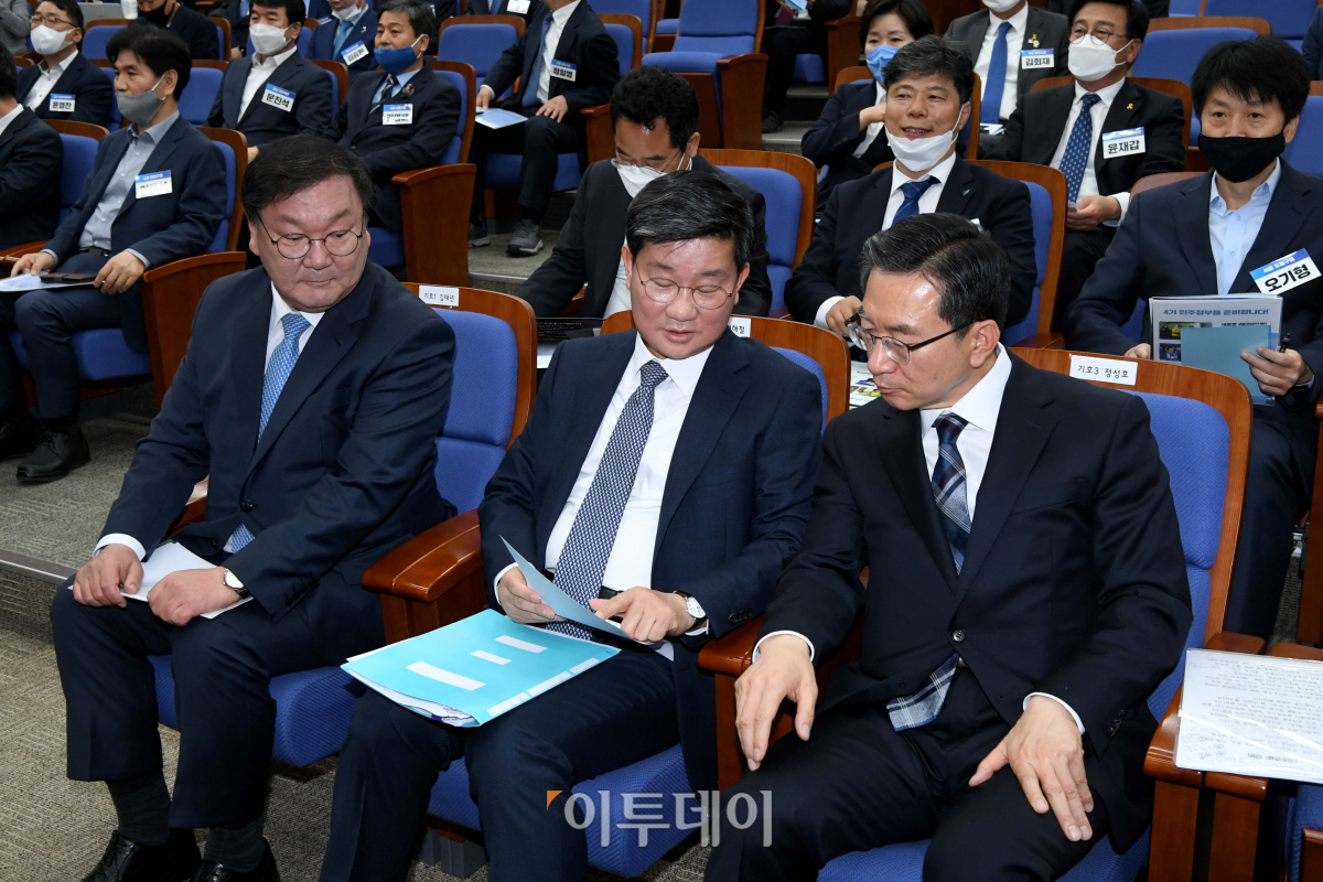 6일 서울 여의도 국회에서 열린 더불어민주당 원내대표 후보자 합동토론회에서 김태년(왼쪽부터), 전해철, 정성호 후보자가 대화하고 있다.