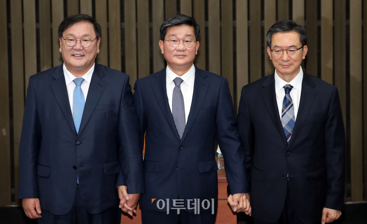 6일 서울 여의도 국회에서 열린 더불어민주당 원내대표 후보자 합동토론회에서 김태년(왼쪽부터), 전해철, 정성호 후보자가 기념촬영을 하고 있다.
