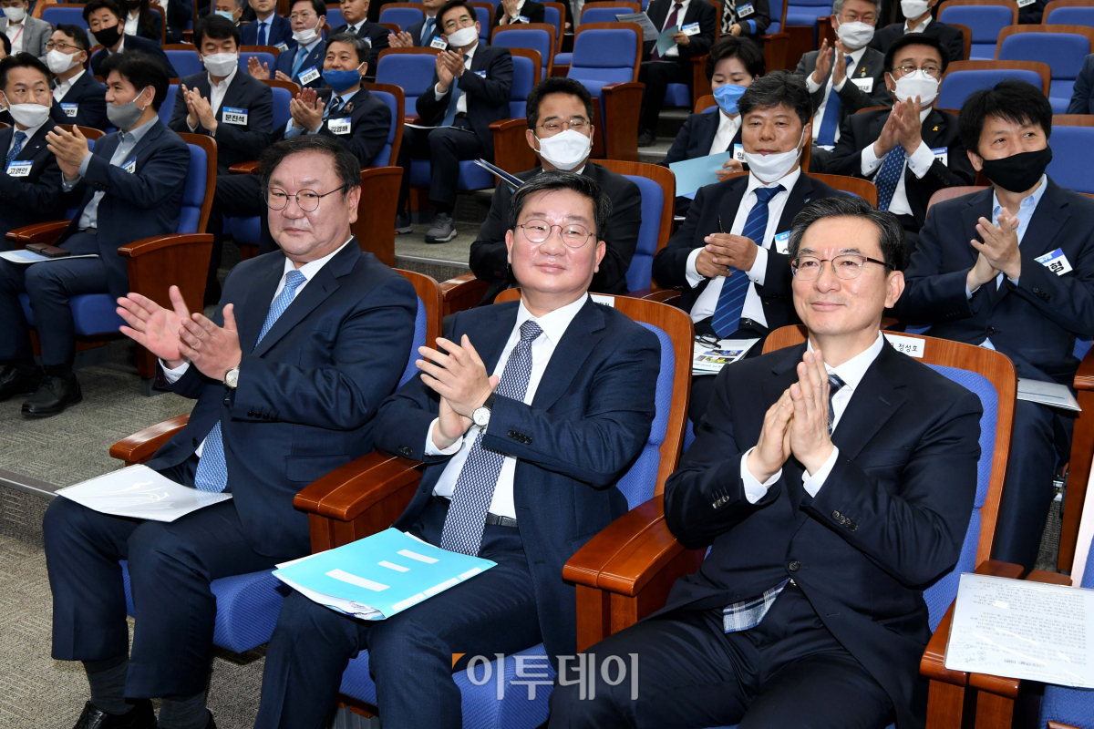 6일 서울 여의도 국회에서 열린 더불어민주당 원내대표 후보자 합동토론회에서 김태년(왼쪽부터), 전해철, 정성호 후보자가 박수치고 있다.