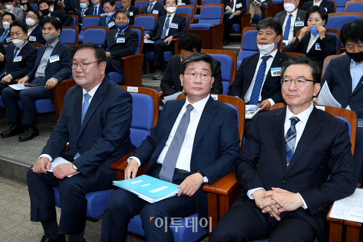 6일 서울 여의도 국회에서 열린 더불어민주당 원내대표 후보자 합동토론회에서 김태년(왼쪽부터), 전해철, 정성호 후보자가 자리에 앉아 있다.