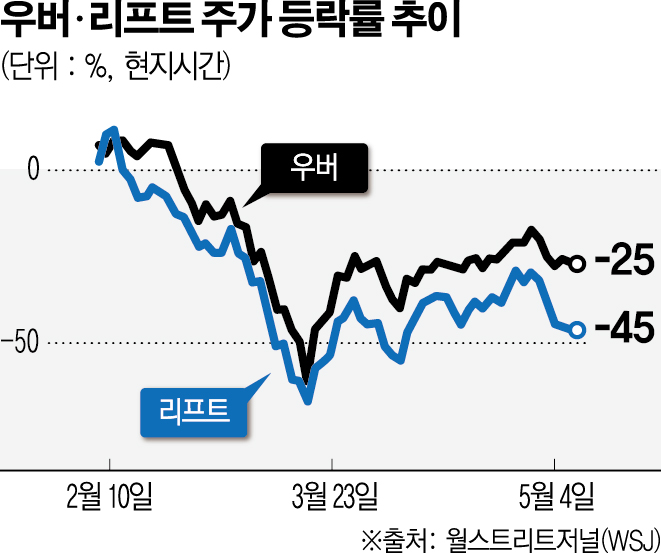 우버와 리프트는 코로나19로 인한 이용객 감소로 실적 침체와 대량 해고라는 우울한 현실에 직면하게 됐다고 6일(현지시간) 월스트리트저널(WSJ)이 진단했다.