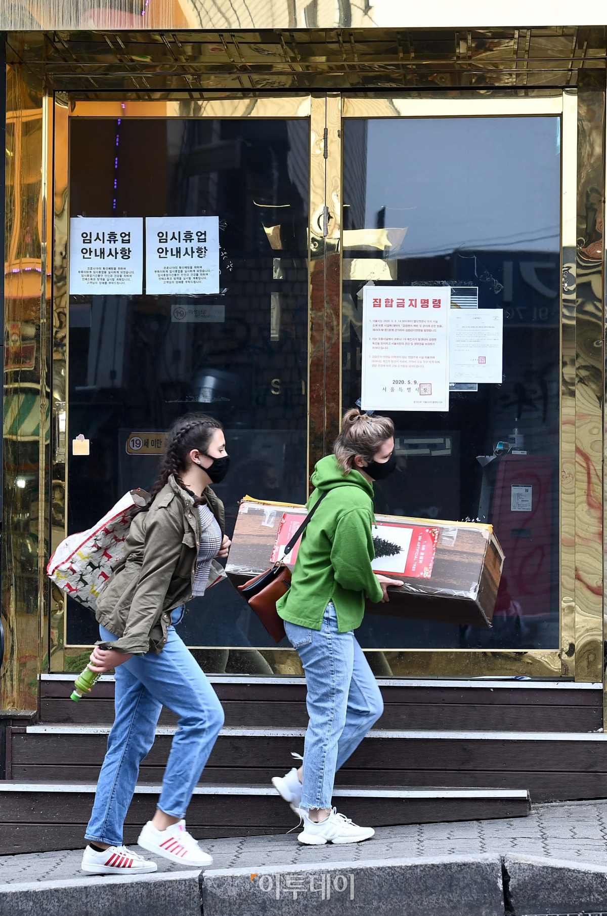서울 이태원 클럽발 신종 코로나바이러스 감염증(코로나19) 집단 감염 등의 영향으로 코로나19 재확산 우려가 커지고 있는 가운데 10일 서울 용산구 이태원의 한 클럽 입구에 집합금지 명령문이 붙어있다. 질병관리본부에 따르면 이날 코로나19 확진 환자는 34명으로 26명은 지역사회 감염 사례였고 해외 입국 확진자는 8명이었다. 하루 신규 환자가 30명을 넘은 건 지난달 12일 32명 이후 28일 만이다.
